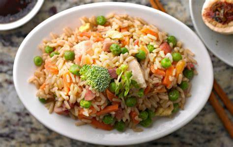 - Ingredientes: arroz cocido, pechuga de pollo cortada en cubos, zanahoria rallada, guisantes, cebolla picada, huevos, aceite vegetal, salsa de soja, sal y pimienta.